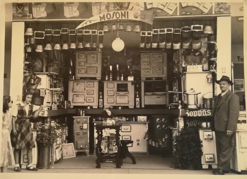 La Ferramenta Mosoni è rimasta in via Briona 35 fino agli anni 90. Durante gli anni 50 il negozio iniziò a trattare articoli per lo sport e la vita in montagna, principalmente per lo sci e cucine a legna, fornelli a gas e stufe, in particolar modo dello storico marchio Zoppas.